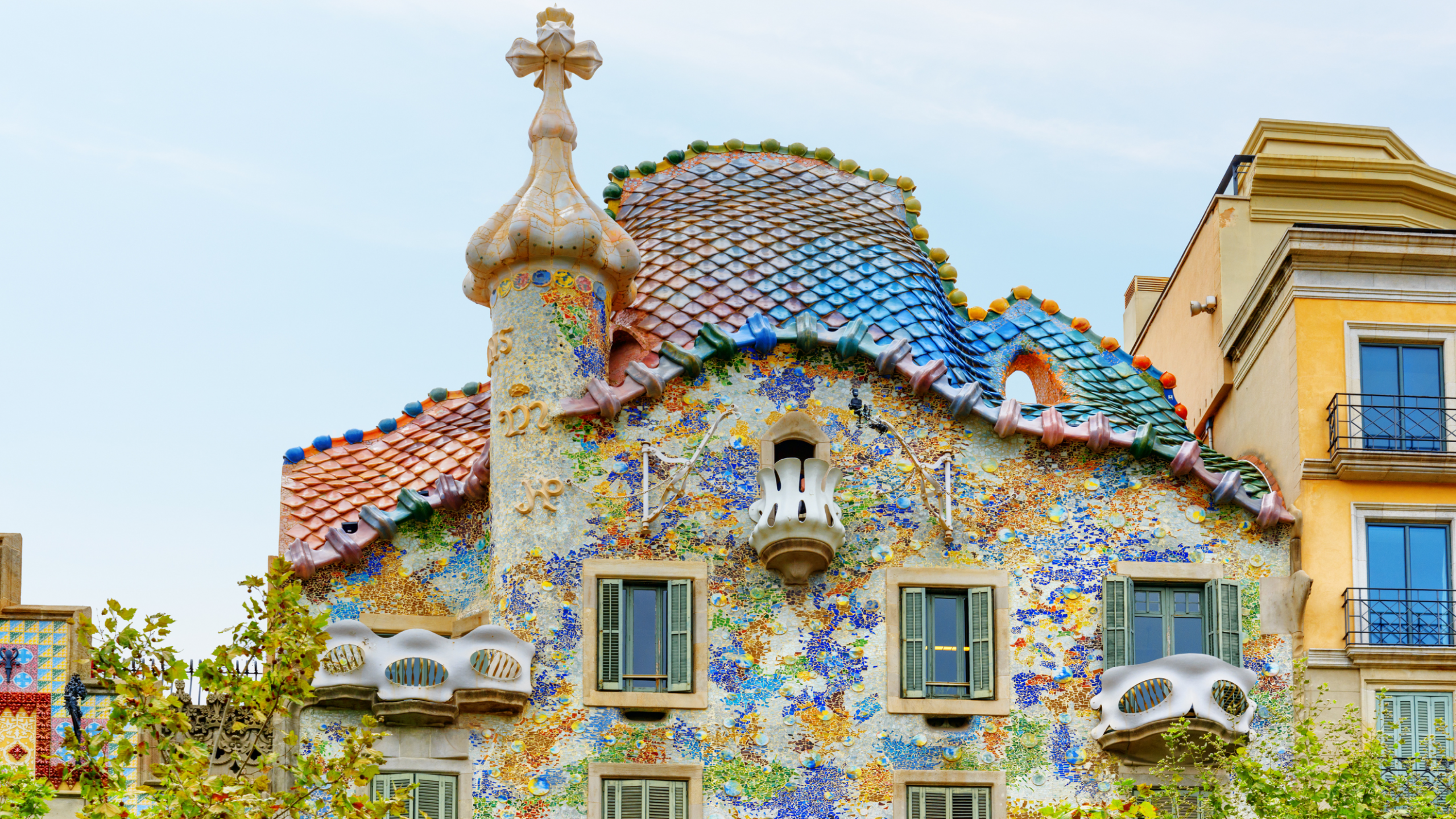 Probably the most photographed façade in Barcelona — and for good reason. Casa Batlló is pure fantasy: waves of color, shimmering tiles, and balconies shaped like masks. The roof looks like the back of a dragon, while the cross on top represents Saint George’s sword — the legendary dragon slayer of Catalonia.